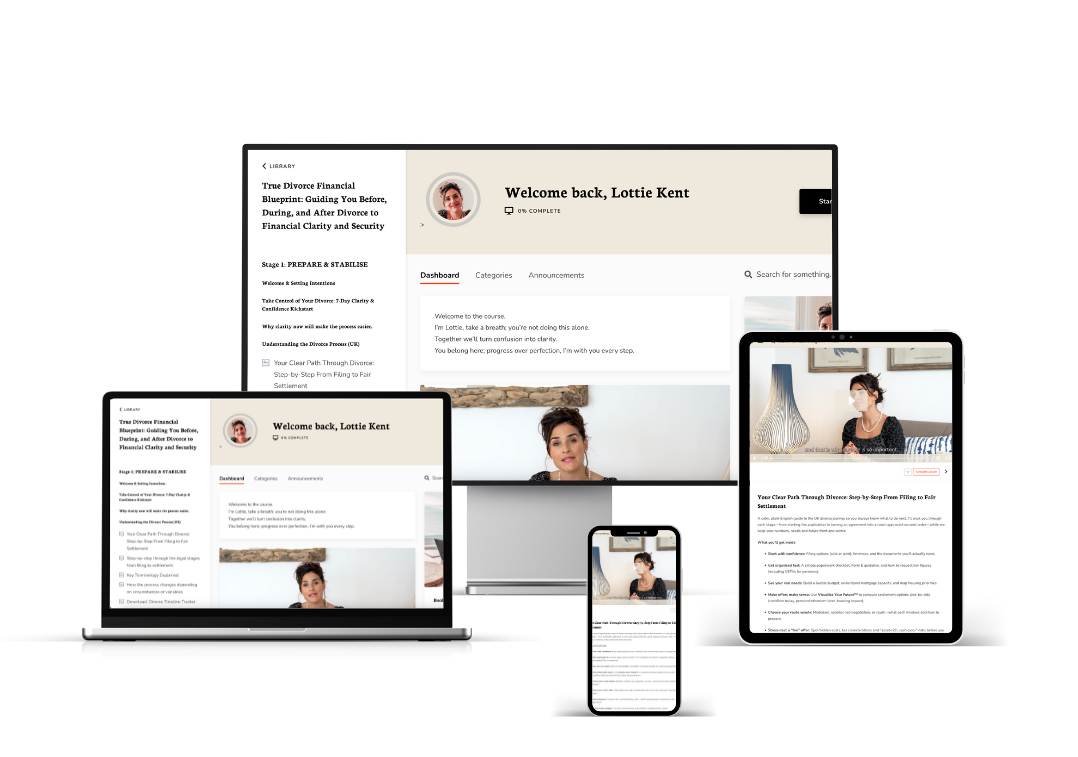 You begin by calming the chaos and getting back in control. With guidance from financial, emotional & legal experts this stage explains the divorce process in simple steps, gives you emotional tools to steady yourself, and lays clear foundations so you can move forward with more confidence and clarity from day one.